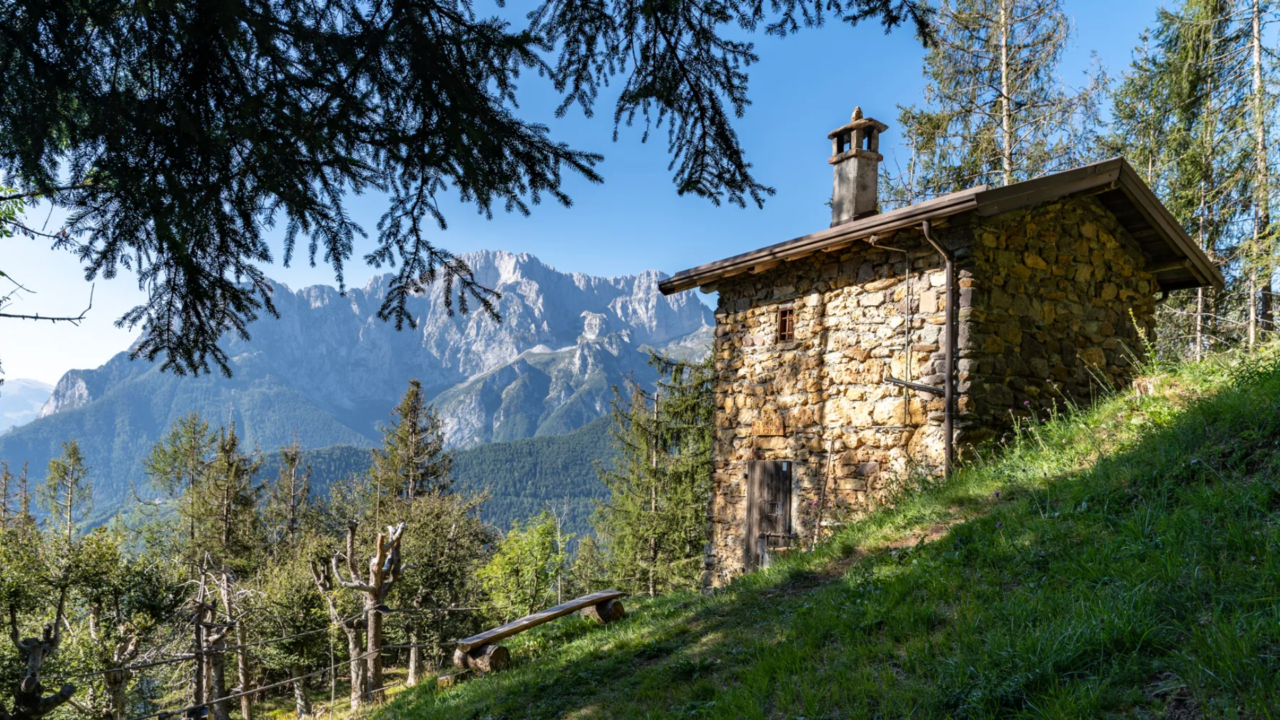 Continue along the partly paved, steep ascent. Pass the farm at the hairpin bend and a rural cluster (i Ruc) at the next bend. Continue uphill, and at the following hairpin (corresponding to a small clearing), stay on the main road (do NOT turn right onto the trail). Continue uphill on the main road; after passing the farm (roof visible on the left), proceed a few meters, leave the road, and take the trail on the left, continuing for about 400 m (pay attention here, as the trail, though easy, passes above a steep forested slope).