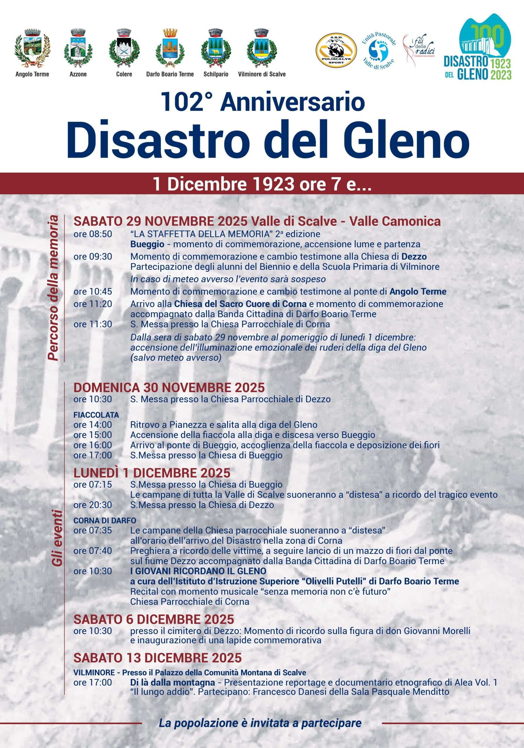 Ricorre, il 1° dicembre 2025, il centoduesimo anniversario dal Disastro del Gleno, e la comunità, sulla scia delle manifestazioni realizzate per il centesimo anno dal disastro, propone anche quest anno una serie di iniziative a ricordo della tragedia, per ravvivare e tenere acceso il ricordo del dramma collettivo legato al crollo della Diga, alle ore 7.15 di quel 1 Dicembre 1923. L’invito agli eventi è aperto a tutta la popolazione e agli interessati.