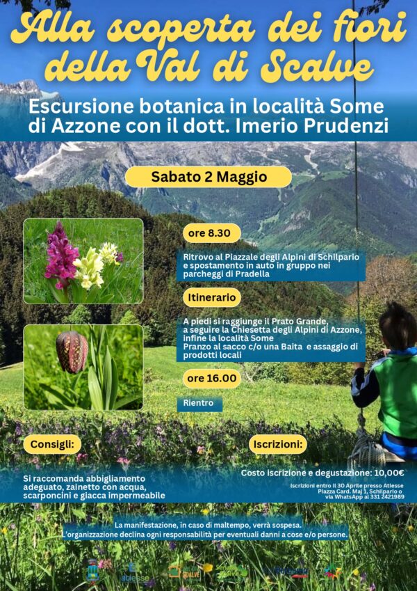 Iscrizione necessaria entro il 30 Aprile, presso l’ufficio turistico Atiesse in Piazza Card. Maj a Schilpario o su Whatsapp al 331 2421989.