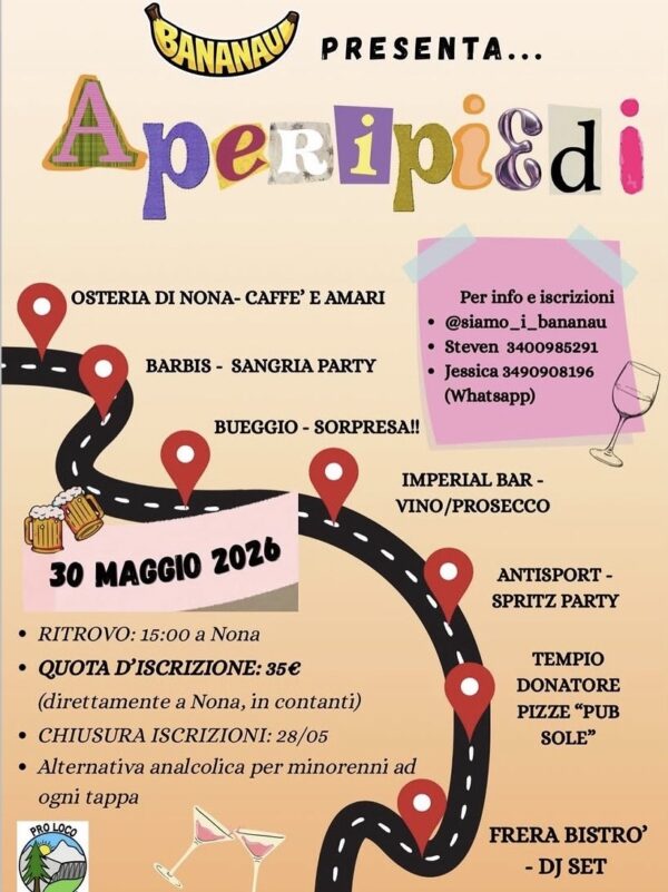 Il 30 maggio 2026 arriva “Aperipiedi”, l’evento che unisce camminata, divertimento e tappe gustose. Il ritrovo è alle 15:00 a Nona, da dove partirà un percorso con diverse soste tra locali e punti ristoro: dall’Osteria di Nona con caffè e amari, al Barbis per il sangria party, passando per una sorpresa a Bueggio, vino e prosecco all’Imperial Bar, spritz party da Antisport, pizze al Pub Sole e finale con DJ set al Frera Bistrò. Per i minorenni è prevista un’alternativa analcolica a ogni tappa
