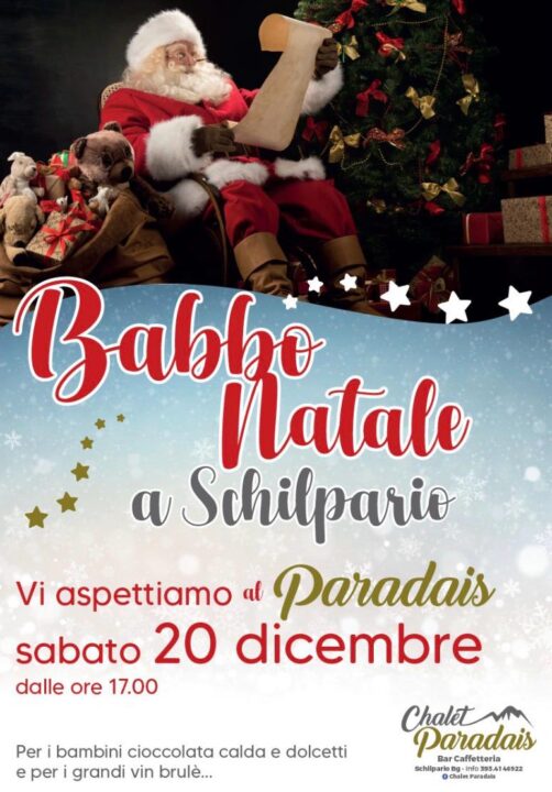 eventi Babbo Natale Schilpario Sabato 20 dicembre vi aspetta Babbo Natale allo Chalet Paradais a Schilpario. Ai bambini verranno donati dolcetti e cioccolata calda, mentre per gli adulti vin brulè. L’appuntamento è alle ore 17:00. Non mancate! Altri eventi Apertura Bar & Self Service di Colere 1600 by Cloud7Hotels Colere 10 Jan 2026 Inaugurazione mostra Manfredo Bendotti: il mio Paese, la mia Gente! Colere 27 Dec 2025 Corsi di Sci scuola Sci Val di Scalve Schilpario 24 Dec 2025 Corsi di sci Colere Polzone Colere 24 Dec 2025 Corsi di sci Colere 2200 Colere 10 Dec 2025 Corsi di sci nordico a Schilpario Schilpario 27 Dec 2025 Eventi invernali in Val di Scalve 2025-2026 Azzone Colere Schilpario Val di Scalve Vilminore di Scalve 1 Dec 2025 Parcheggio in località Fondi a Schilpario Schilpario 15 Nov 2025 Pista di Pattinaggio Paradiso Schilpario 28 Dec 2025