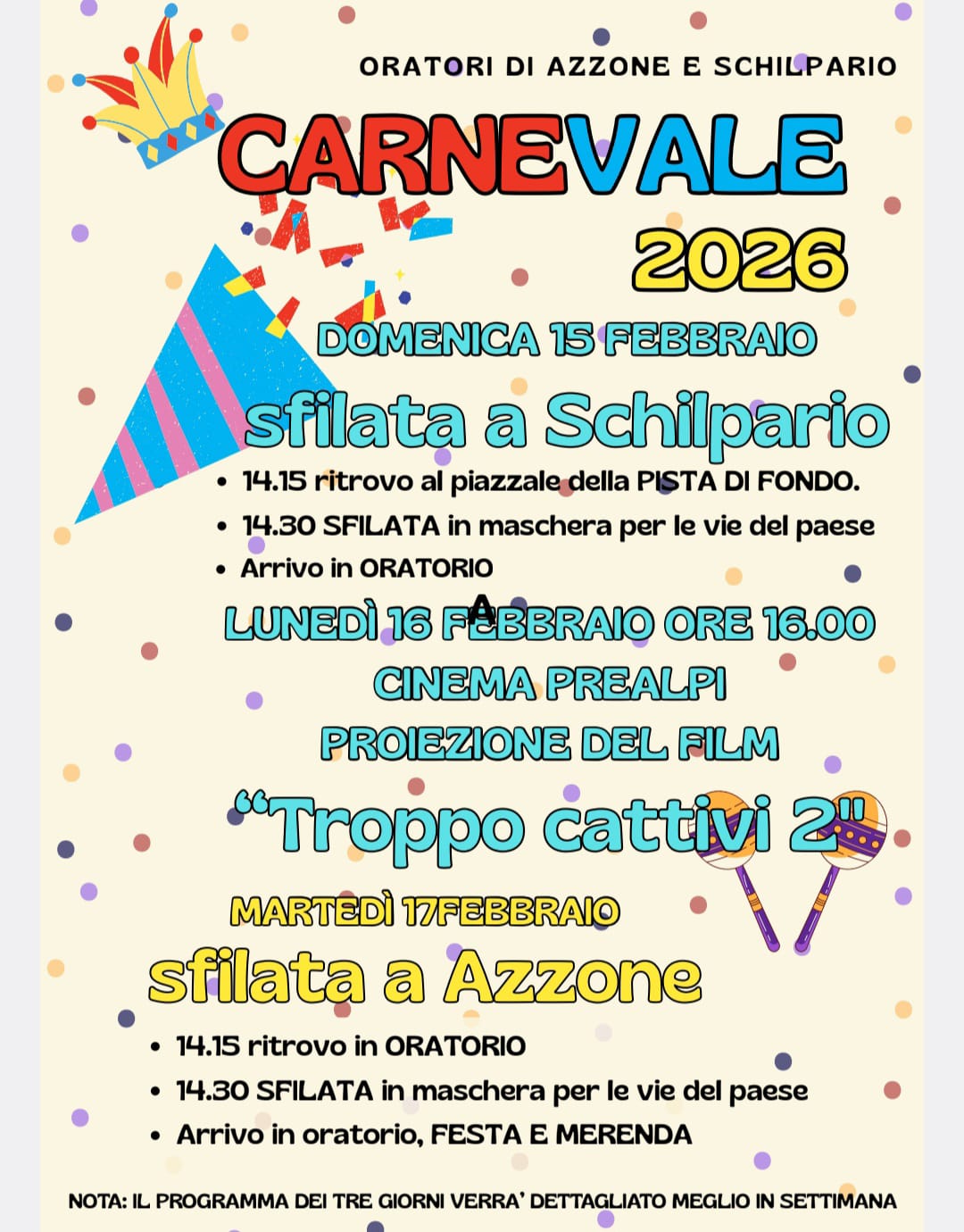 Martedì 17 febbraio, ci saranno i festeggiamenti ad Azzone. Ci ritroveremo alle 14:15 in oratorio per poi partire alle 14:30 per sfilata. Concluderemo la giornata in oratorio con una festa e una merenda per tutti.