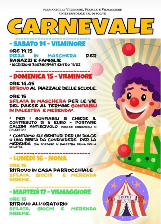 Carnevale 2026, le parrocchie di Vilminore, Pezzolo e Vilmaggiore organizzano una serie di iniziative per animare la comunità e portare festa e divertimento per grandi e piccini.