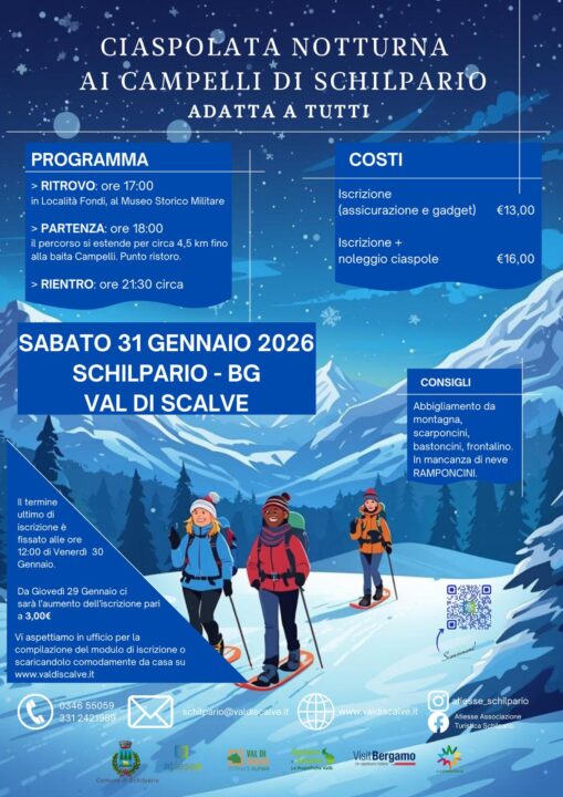 Il ritrovo è Sabato 31 gennaio alle ore 17:00 in Località Fondi, al Museo Storico Militare. Si parte alle ore 18:00, ciaspolando in compagnia per circa 4,5 km fino alla baita Campelli, punto di ristoro. Il rientro è previsto alle ore 21:30 circa.