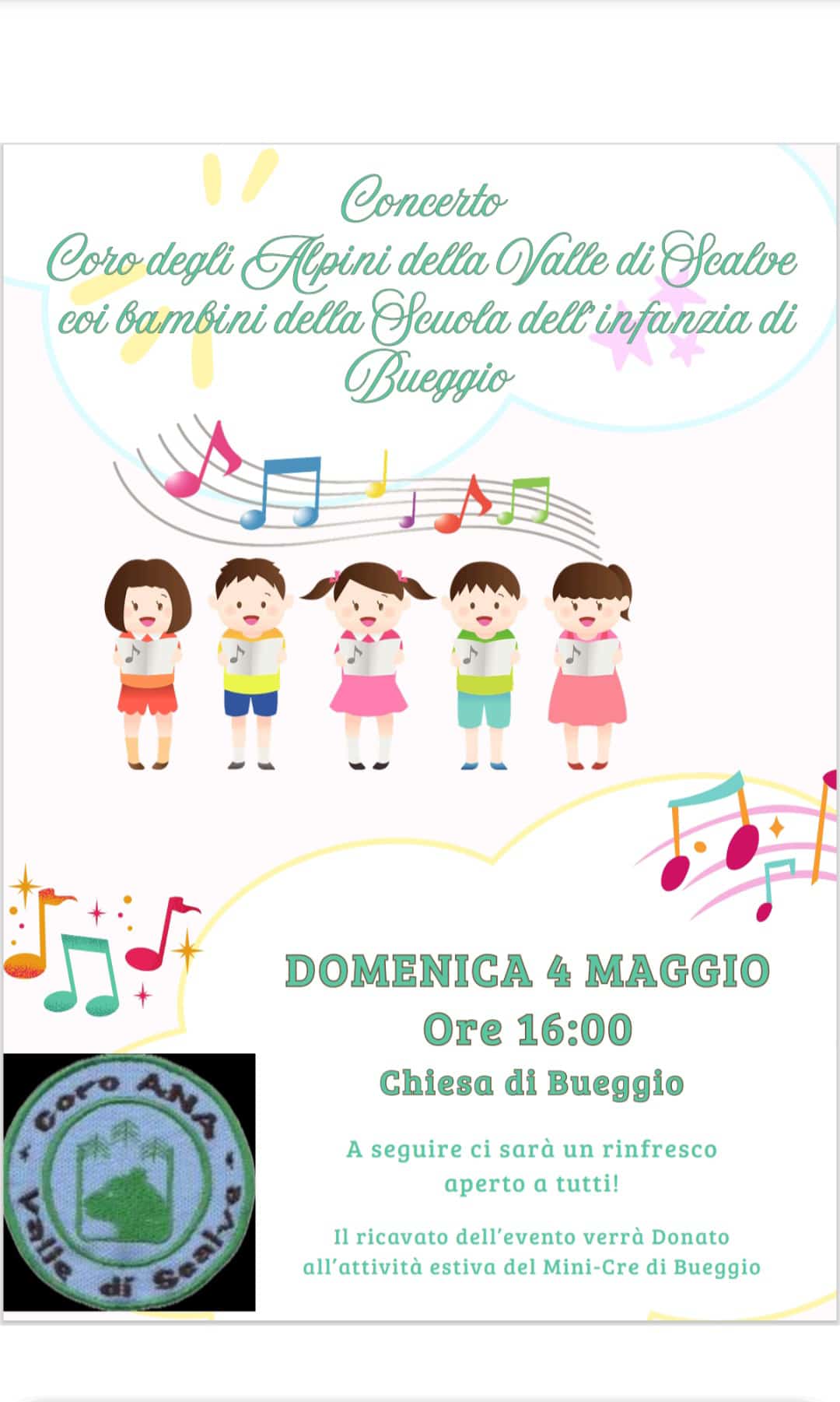 Nella graziosissima chiesa della frazione di Bueggio, domenica 4 Maggio alle ore 16:00, si esibirà in concerto il coro degli Alpini della Valle, con i bambini della scuola dell’infanzia di Bueggio.