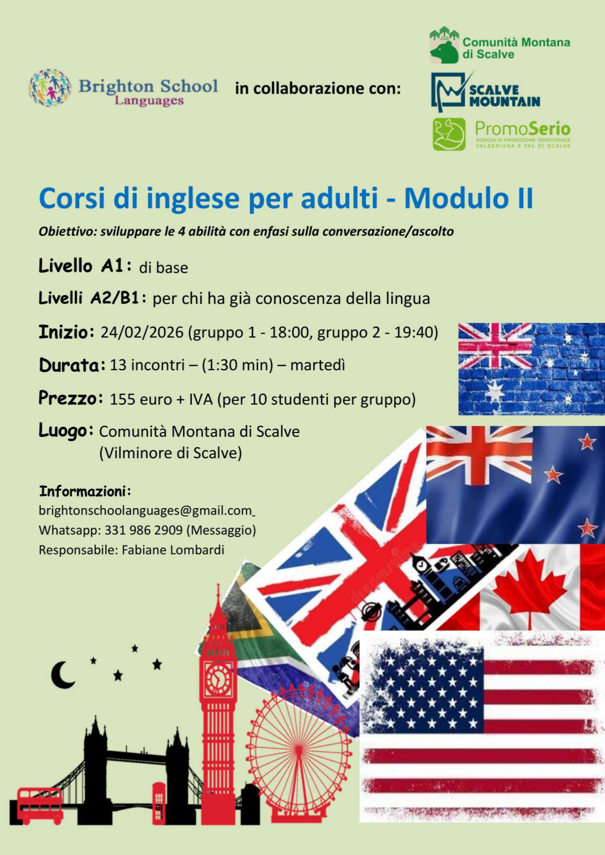 Non perdete l’occasione di rispolverare le vostre conoscenze di inglese o acquisirne di nuove con i corsi di inglese per adulti che si terranno a Vilminore di Scalve presso il Palazzo della Comunità Montana. L’inizio dei corsi è previsto per martedì 24 febbraio con orario serale (18.00 o 19.40, a seconda del gruppo), con lezioni da un’ora e mezza per un totale di 13 incontri.