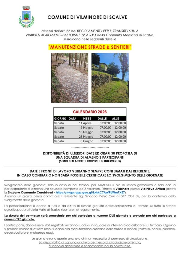 Secondo quando previsto dall’art. 22 del REGOLAMENTO PER IL TRANSITO SULLA VIABILITÀ AGRO-SILVO-PASTORALE (V.A.S.P.) della Comunità Montana di Scalve, il Comune di Vilminore di Scalve indice le “GIORNATE DELLE STRADE”