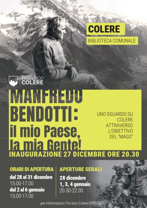 La Pro Loco Colere, per ricordare la recente scomparsa del compaesano e celebrare il genio del “Mago”, propone, dal 27 dicembre al 6 gennaio, presso la biblioteca di Colere, la mostra “Manfredo Bendotti: il mio Paese, la mia Gente”, uno sguardo su Colere attraverso l’obiettivo di Manfredo Bendotti.