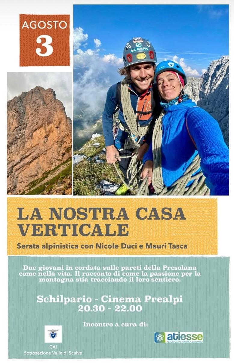 Domenica 3 Agosto, al cinema Prealpi alle 20.30 la sottosezione CAI valle di Scalve, organizza, in collaborazione con Atiesse, associazione turistica Schilpario, una serata alpinistica con Nicole Duci e Mauri Tasca, due giovani alpinisti, in cordata sulle pareti della Presolana, così come nella vita.