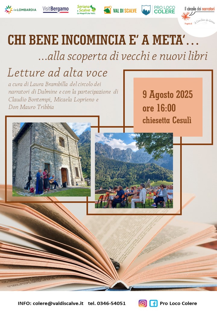 eventi Arte, Cultura e Tradizione Lettura ad alta voce: chi bene incomincia è a meta… Sabato 9 agosto, alla chiesetta del Cesulì a Colere, vi aspetta un momento di compagnia alla scoperta dei vecchi e nuovi libri. per info: Pro Loco Colere – 0346.54051 Altri eventi Corsi di sci Colere Polzone Colere 24 Dec 2025 Corsi di sci Colere 2200 Colere 10 Dec 2025 Festa dell’asilo winter edition Colere 3 Jan 2026 Eventi invernali in Val di Scalve 2025-2026 Azzone Colere Schilpario Val di Scalve Vilminore di Scalve 1 Dec 2025 Passeggiando tra i presepi – 2° appuntamento Colere 4 Nov 2026 Passeggiando tra i presepi – 1° appuntamento Colere 30 Dec 2025 Torneo di Calciobalilla Colere 30 Dec 2025 Capodanno Aperipriff Colere 31 Dec 2025 Arriva Santa Lucia! Colere 12 Dec 2025