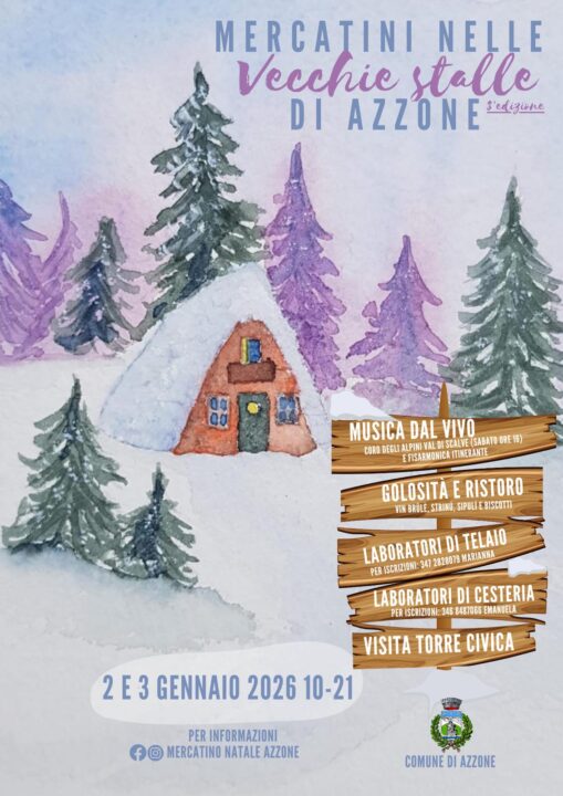 Ritornano anche quest anno, dopo il successo delle scorse edizioni, i mercatini di Natale nelle vecchie stalle di Azzone. Venerdì 2 e sabato 3 gennaio, per le vie del paese.