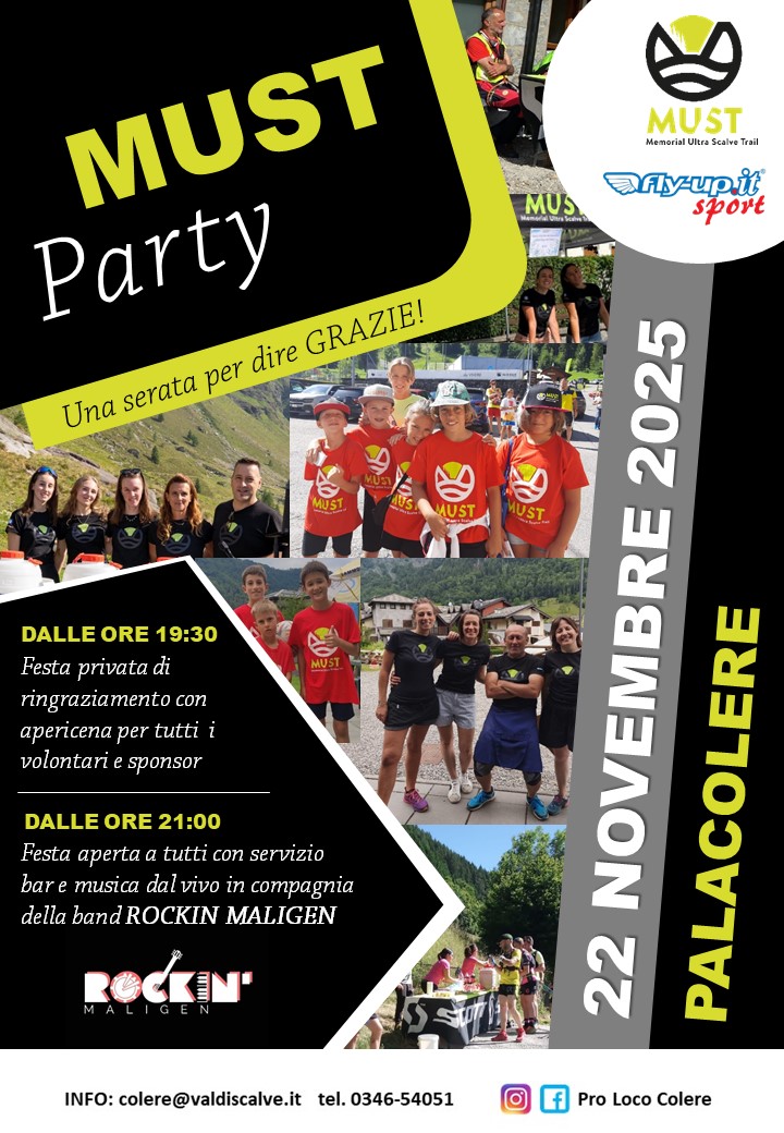 Il gruppo degli organizzatori della MUST ( Memorial Scalve Ultra Trail ) organizza a Colere, sabato 22 Novembre, una festa per ringraziare tutti i volontari e gli sponsor che hanno consentito la buona riuscita e il successo della gara di corsa tenutasi quest estate.