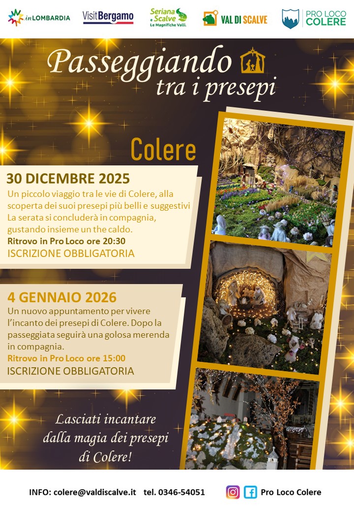 La Pro Loco organizza inoltre due passeggiate accompagnate alla scoperta dei presepi di Colere. Il secondo appuntamenti vi aspetta Domenica 4 Gennaio, nel pomeriggio, a partire dalle 15.00 , con ritrovo presso la Pro Loco in Piazza Risorgimento.