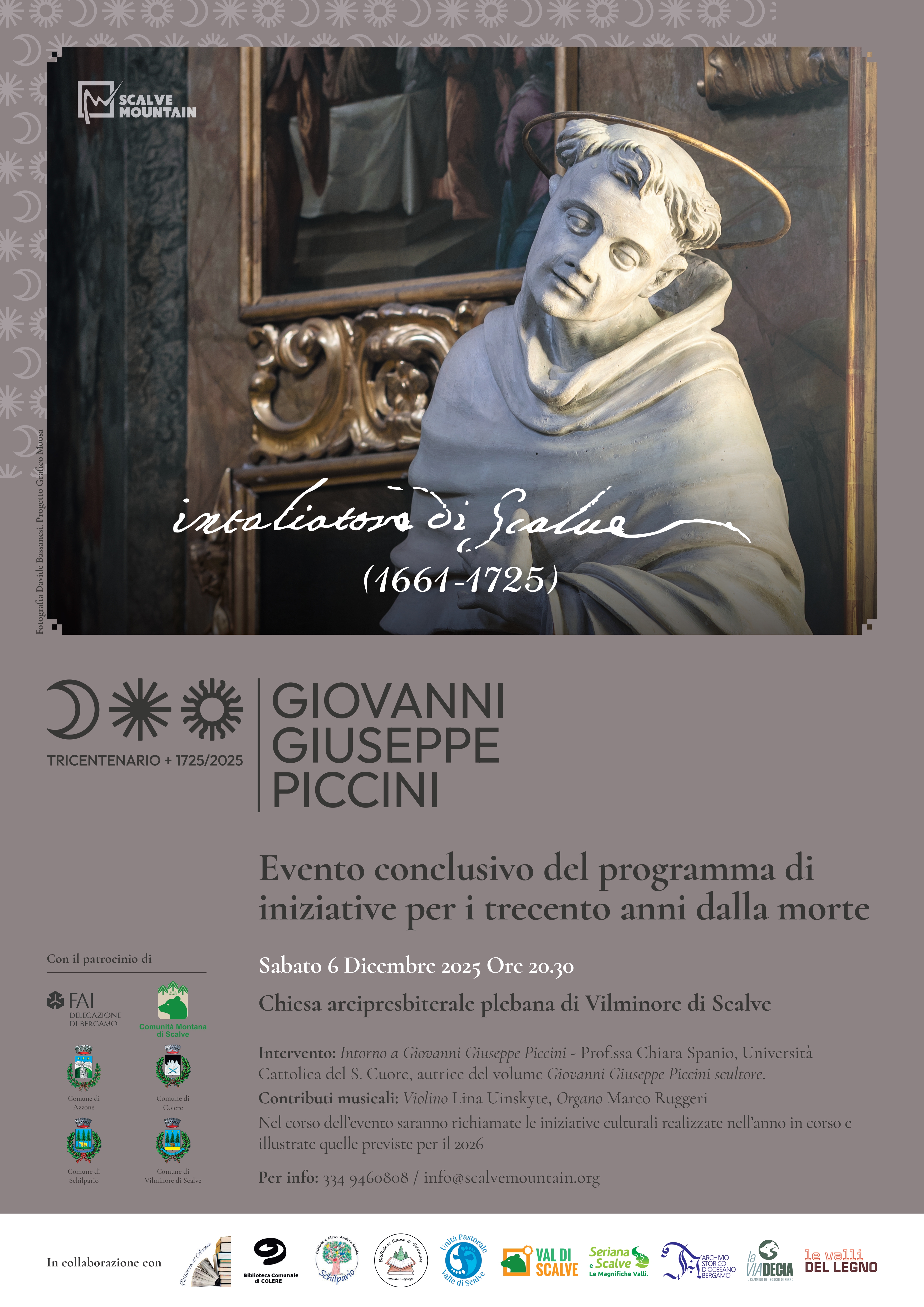 Sabato 6 dicembre alle 20.30 presso la Chiesa di Vilminore si terrà una serata dedicata al racconto delle iniziative che hanno accompagnato il tricentenario della morte dello scultore Giovanni Giuseppe Piccini e per anticipare quelle che seguiranno nel 2026. Inoltre, la professoressa Chiara Spanio – autrice della monografia Giovanni Giuseppe Piccini scultore – proporrà una relazione dedicata al grande artista di Nona di Scalve.