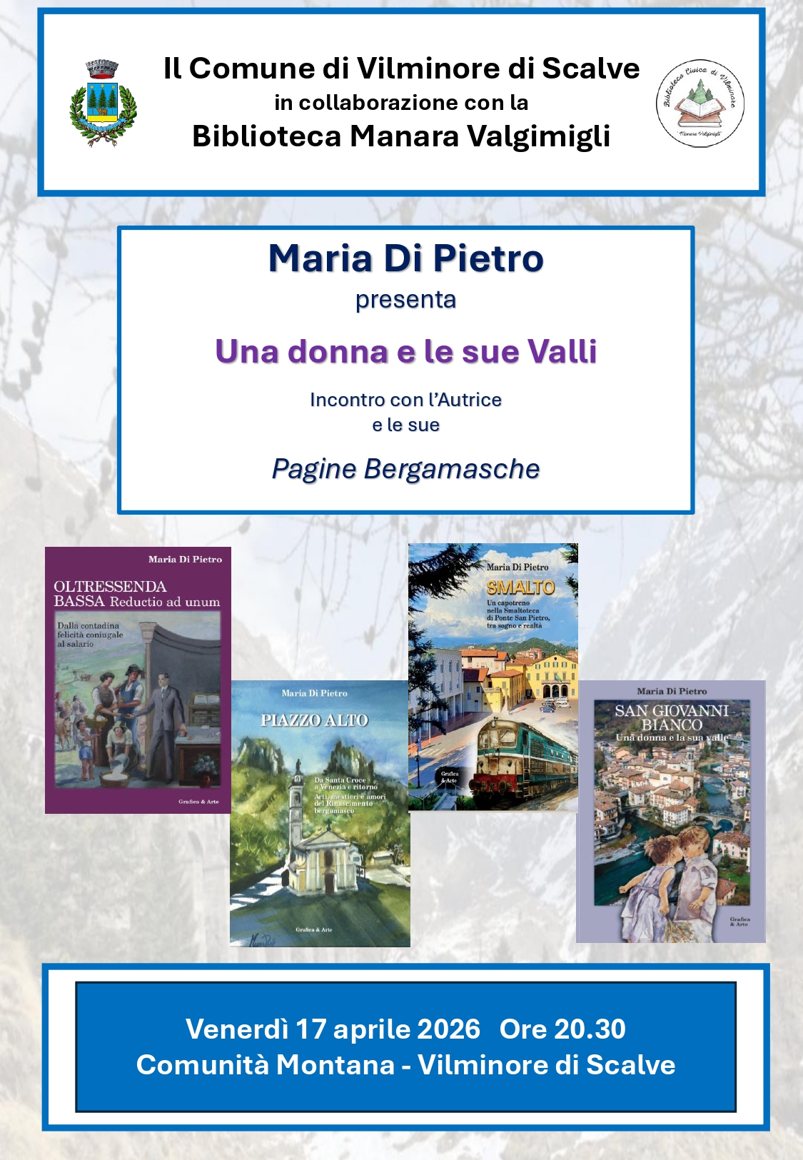 Il comune di Vilminore di Scalve, in collaborazione con la biblioteca civica Manara Valgimigli organizza, venerdì 17 Aprile, alle 20.30 presso il palazzo Pretorio a Vilminore, la presentazione “Una donna e le sue Valli”: incontro con l’Autrice Maria di Pietro e le sue Pagine Bergamasche.