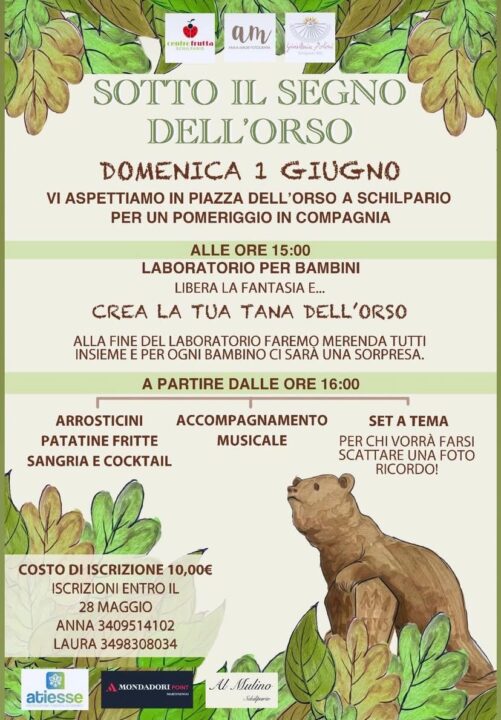 Dalle ore 15:00 laboratori per bambini, libera la tua fantasia e…crea la tua tana dell’Orso! Al termine dei laboratori merenda con sorpresa per tutti i bambini. A partire dalle 16:00, arrosticini, patatine fritte, sangria e cocktails, accompagnamento musicale e set a tema, per tutti quelli che vorranno fermarsi a scattare una foto ricordo!