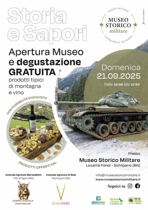 Domenica 21 Settembre, in concomitanza della Transumanza di Schilpario, il Museo storico militare  organizza un’apertura straordinaria, accompagnata da prodotti tipici di montagna e vino. Possibilità di degustazione dei prodotti dell’azienda agricola Morstabilini di Villa d’Ogna (BG), accompagnati dallo ScalVino, azienda Agricola Al Sole di Piancogno (BS). Possibilità di acquisto dei prodotti.