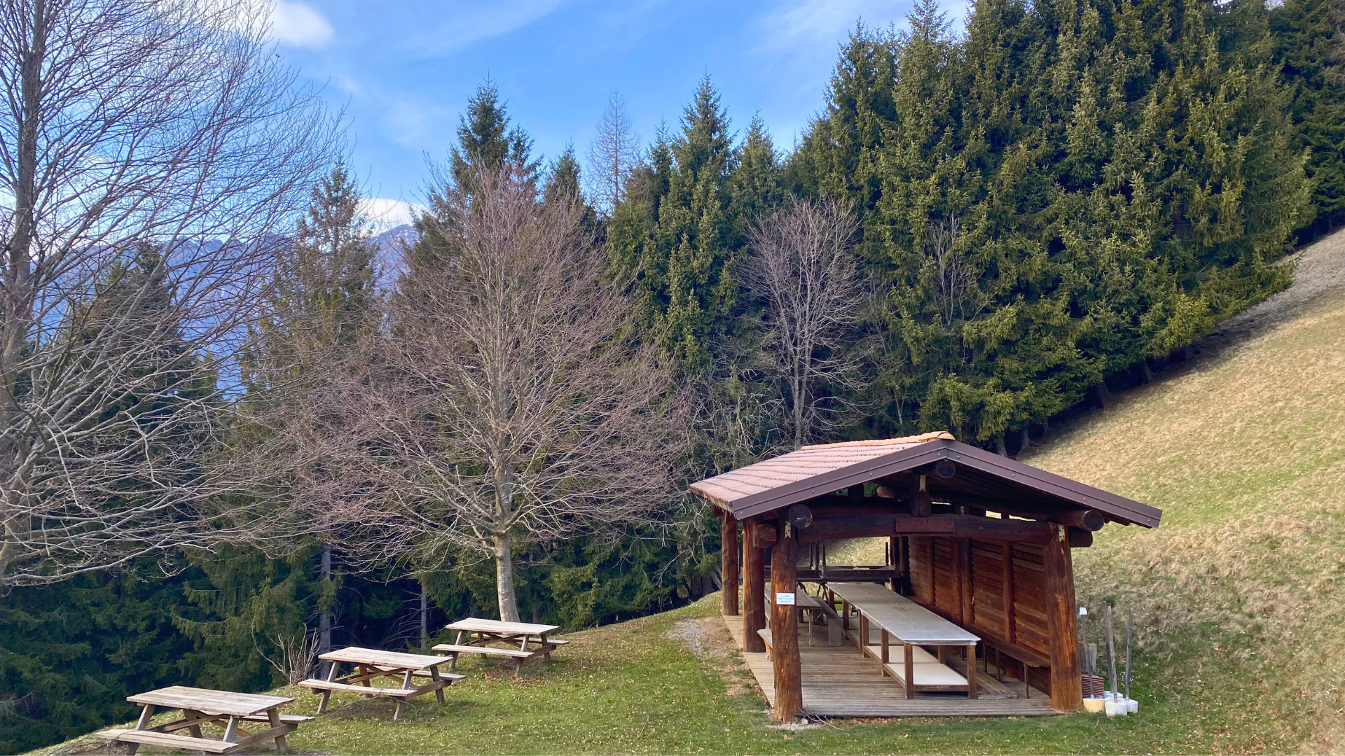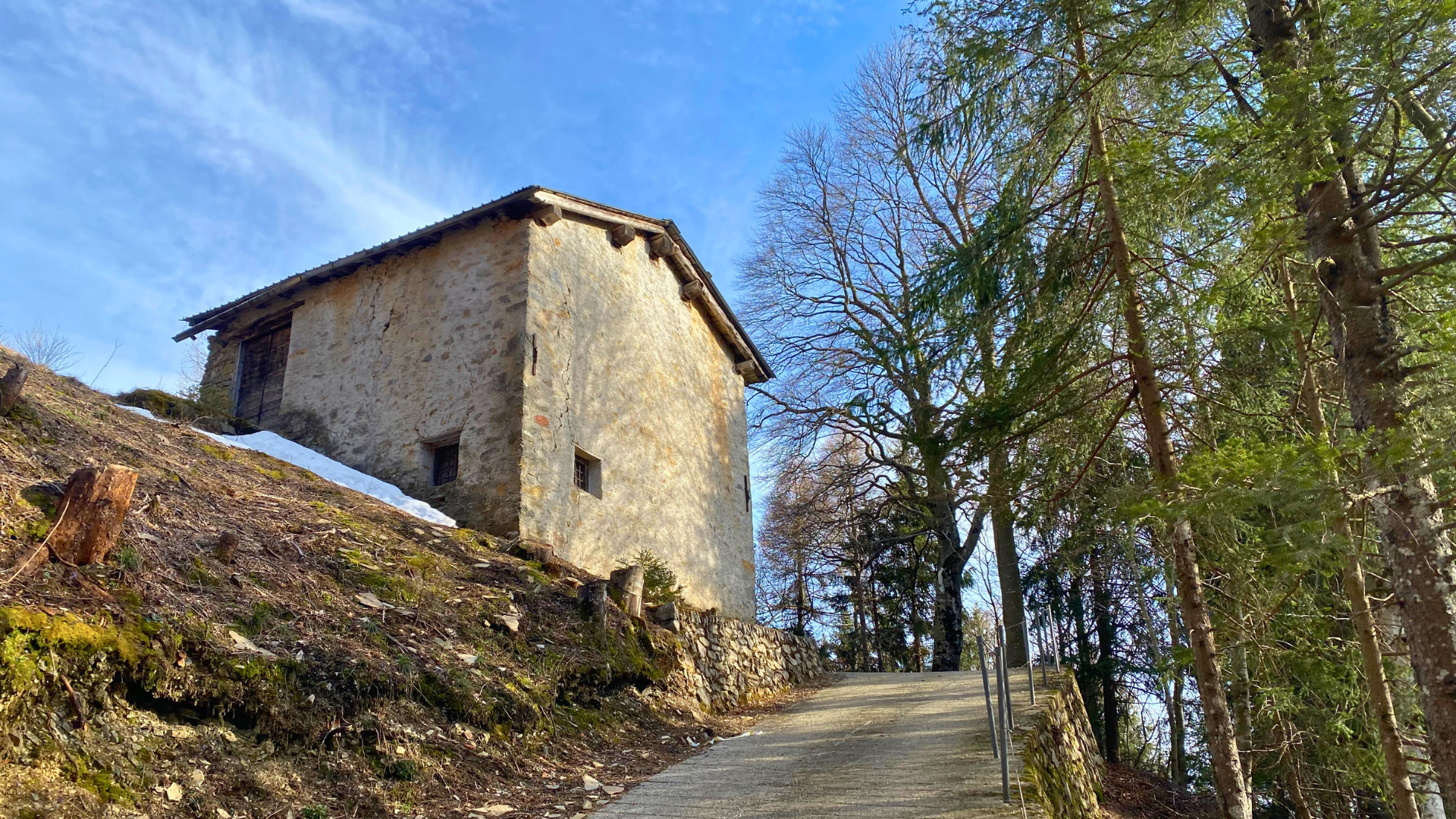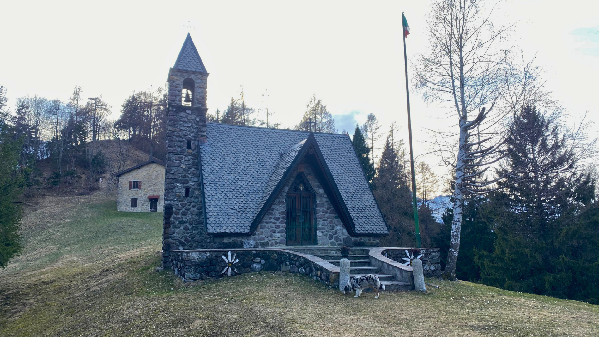 Da quì dovrete procedere scendendo lungo la strada Vasp a destra per circa una ventina di minuti, fino ad arrivare alla Chiesetta Alpina. Presso questo spiazzo, potrete ammirare, da un lato, il roccolo delle Streghe, e dall’altro, la piccola chiesina Alpina, con il caratteristico campanile a punta.