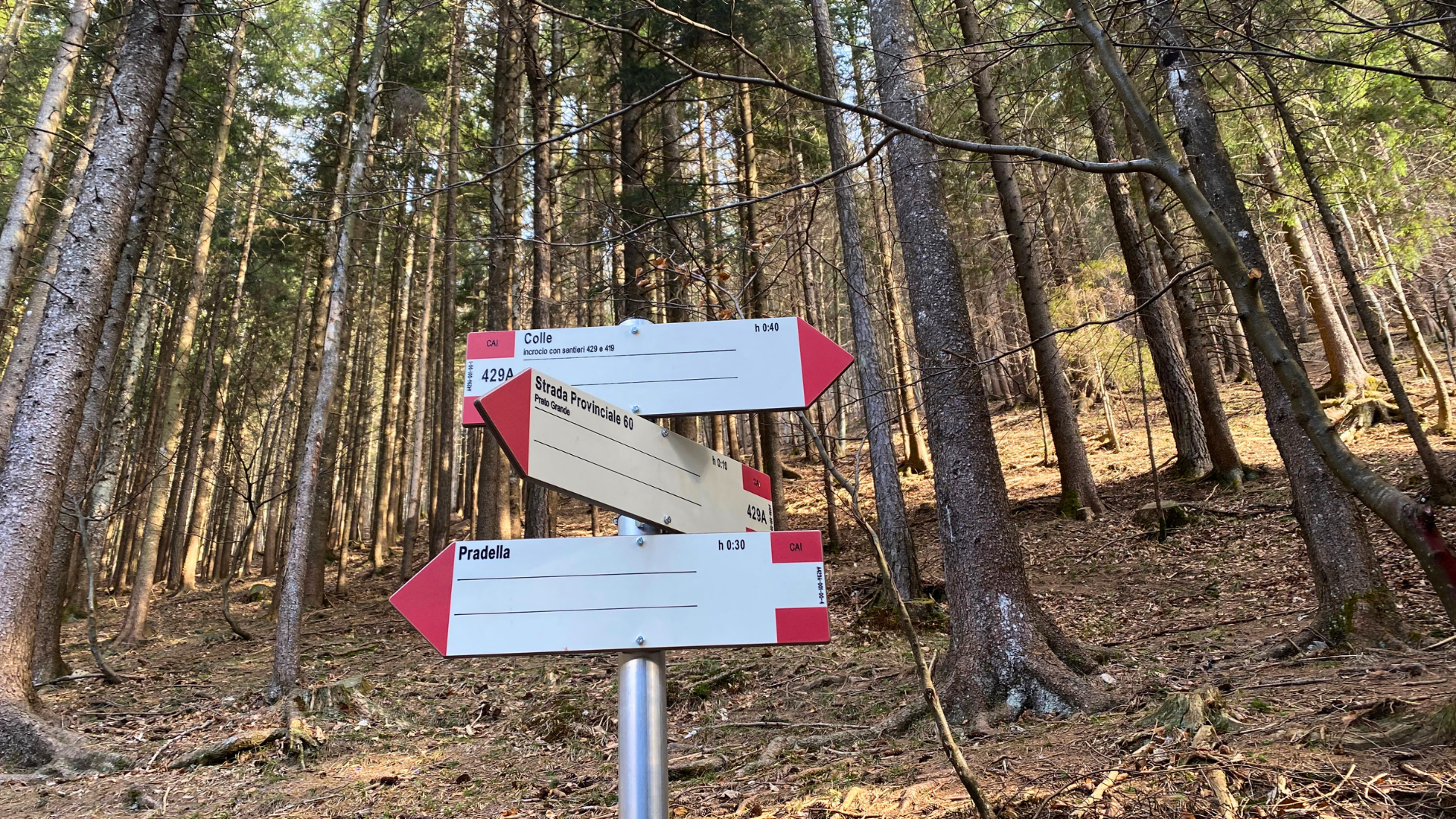 Lungo il percorso sono presenti alcuni punti con acqua, soprattutto nella parte iniziale. Procedete ancora dritti nel bosco seguendo le indicazioni che portano verso Azzone e la chiesetta Alpina, arrivati al bivio per salire verso il “Colle”, prendete il sentiero che sale verso sinistra. Dopo un pezzo di salita più ripida, sarete arrivati alla località “Colle”, segnalata dall’incisione in legno.