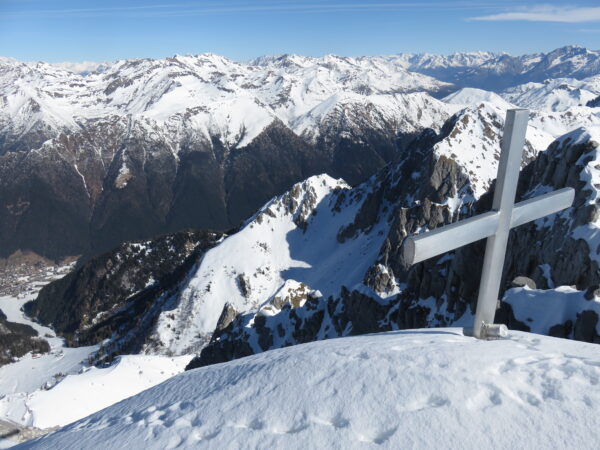 Lasciati gli sci si continua a salire nel canalino stretto e ripido che conduce alla cresta dalla quale, in breve, si raggiunge la vetta (2491 m.)